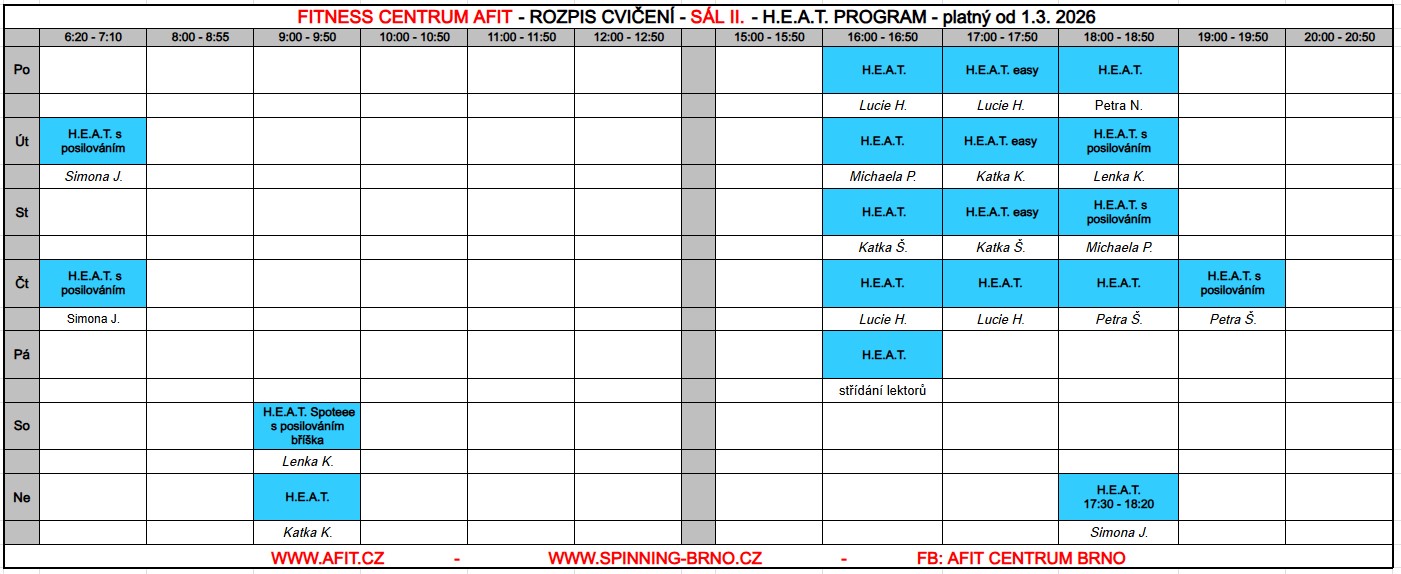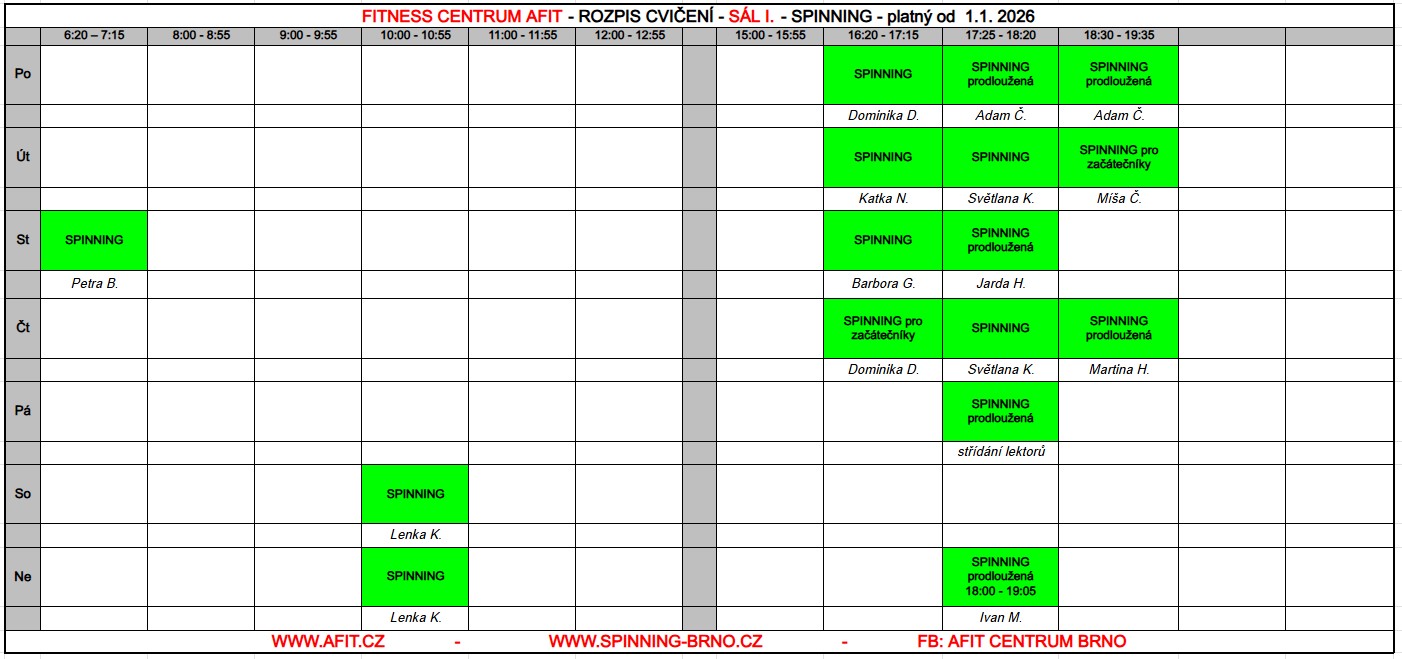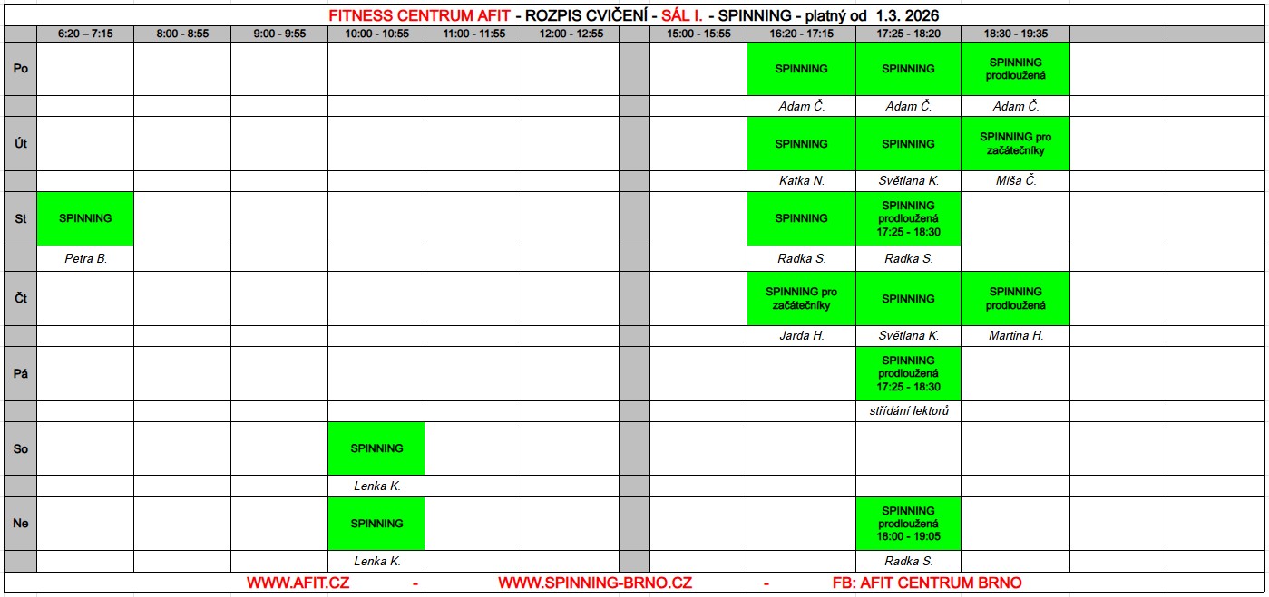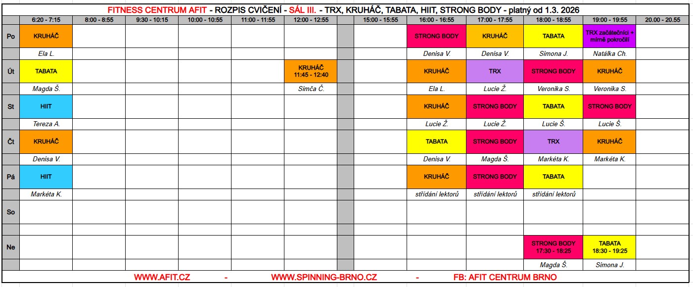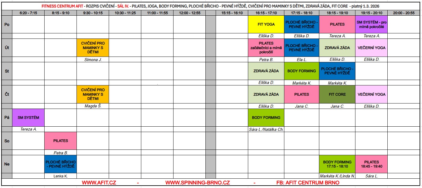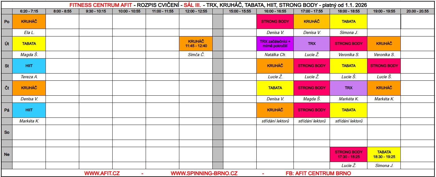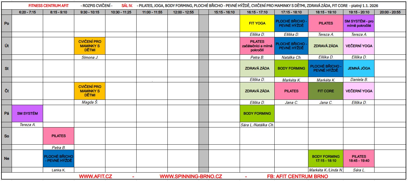 Provozovatel fitness centra AFIT si vyhrazuje právo na změny v rozvrhu. Těmito změnami můžou být například neplánované zástupy instruktorů na skupinových lekcích nebo například naléhavé zrušení lekce z vážných technických nebo zdravotních důvodů.