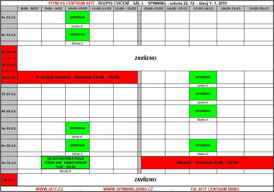 Vánoční rozpis cvičení od soboty 22. 12. do úterý 1. 1. 2019
